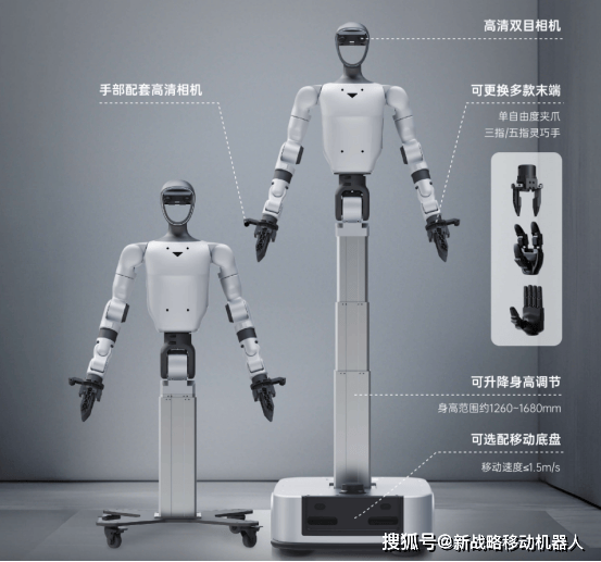 别的,机械人的头部配备高清双目相机,腕部配套了高清相机,还能选配挪动底盘:通用版没有设置装备摆设挪动底盘,旗舰版所设置装备摆设的挪动底盘速度为1。5m/s,支撑原地360°扭转;通用版续航时间约2小时,旗舰版约6小时。